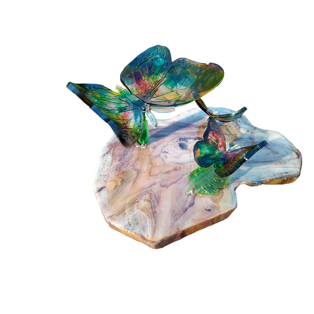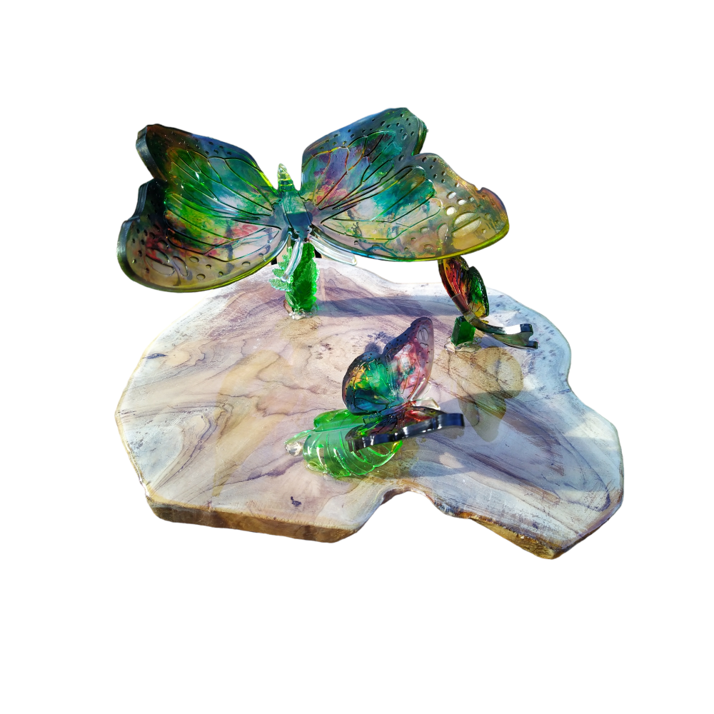 standaard van epoxy met 3 vlinders op houten voet