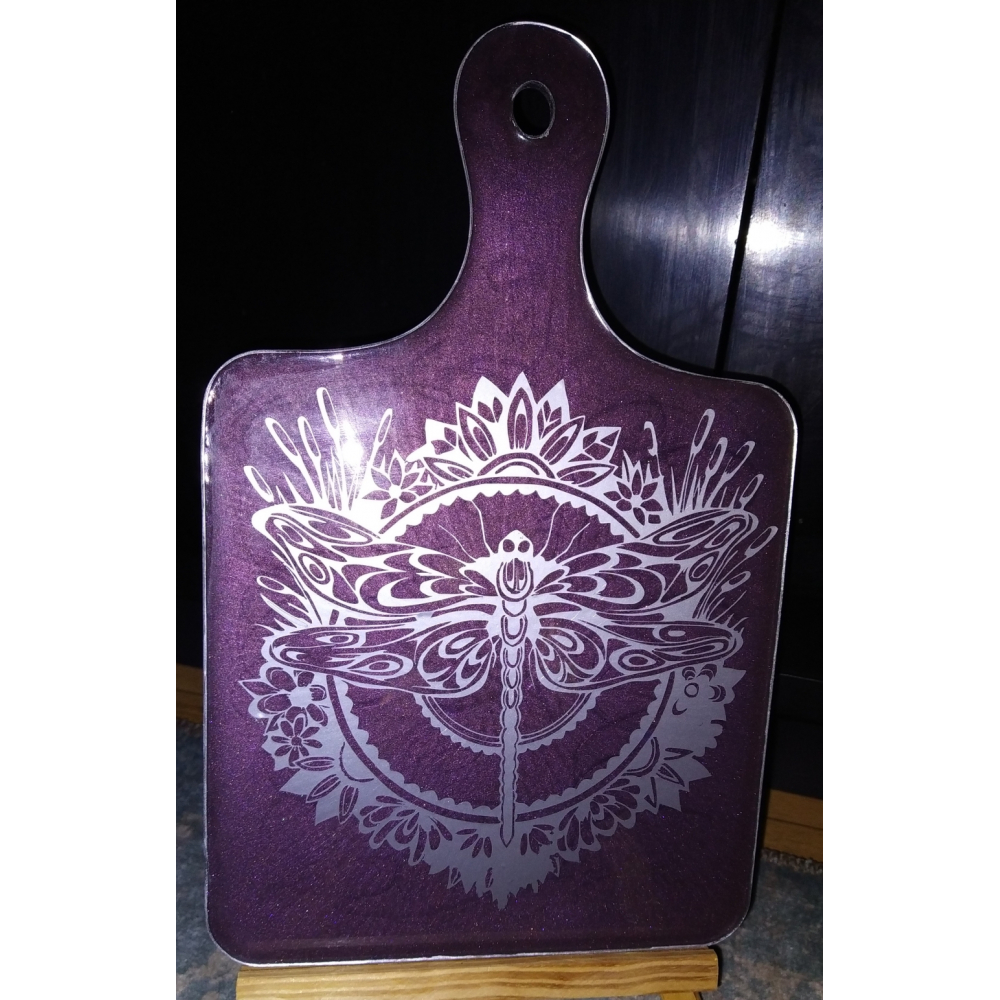 serveerplankje van epoxy in de kleur super red wine met een libelle van zilvergrijs vinyl afgewerkt met een chrome rand
