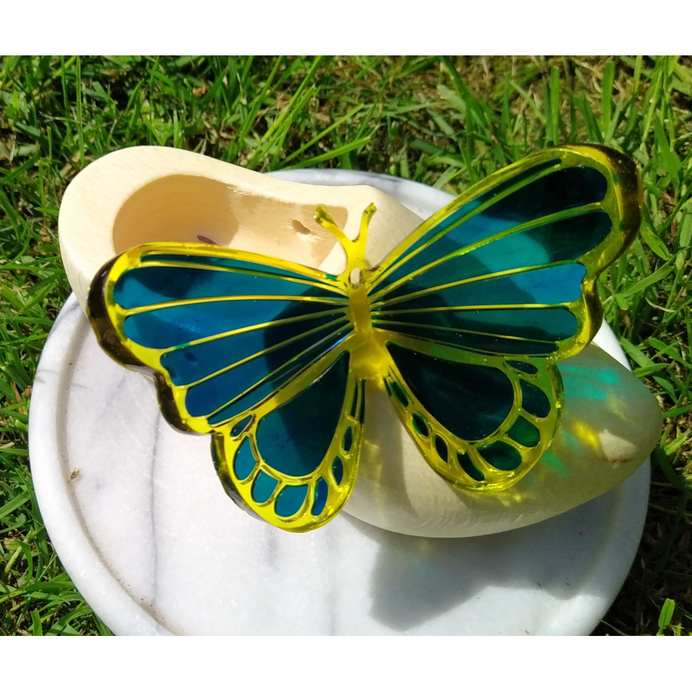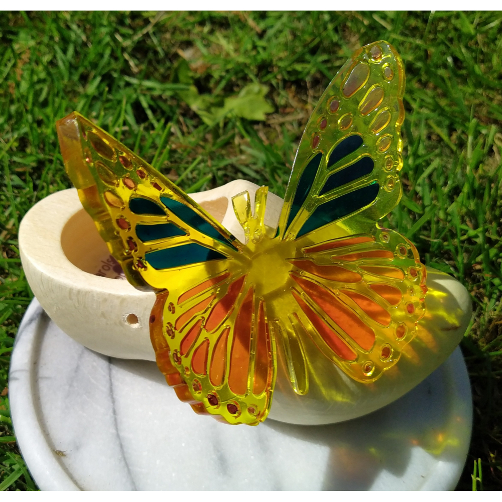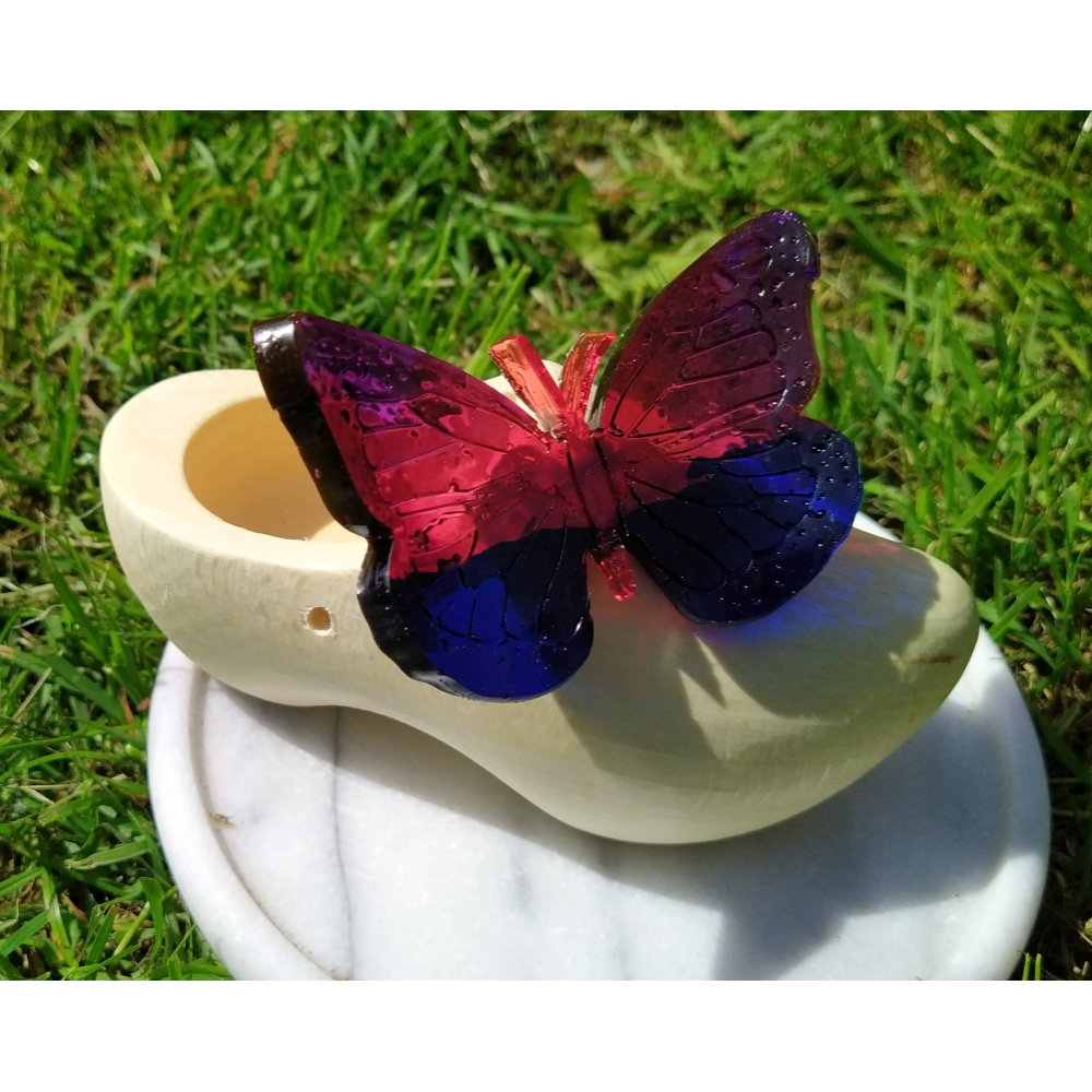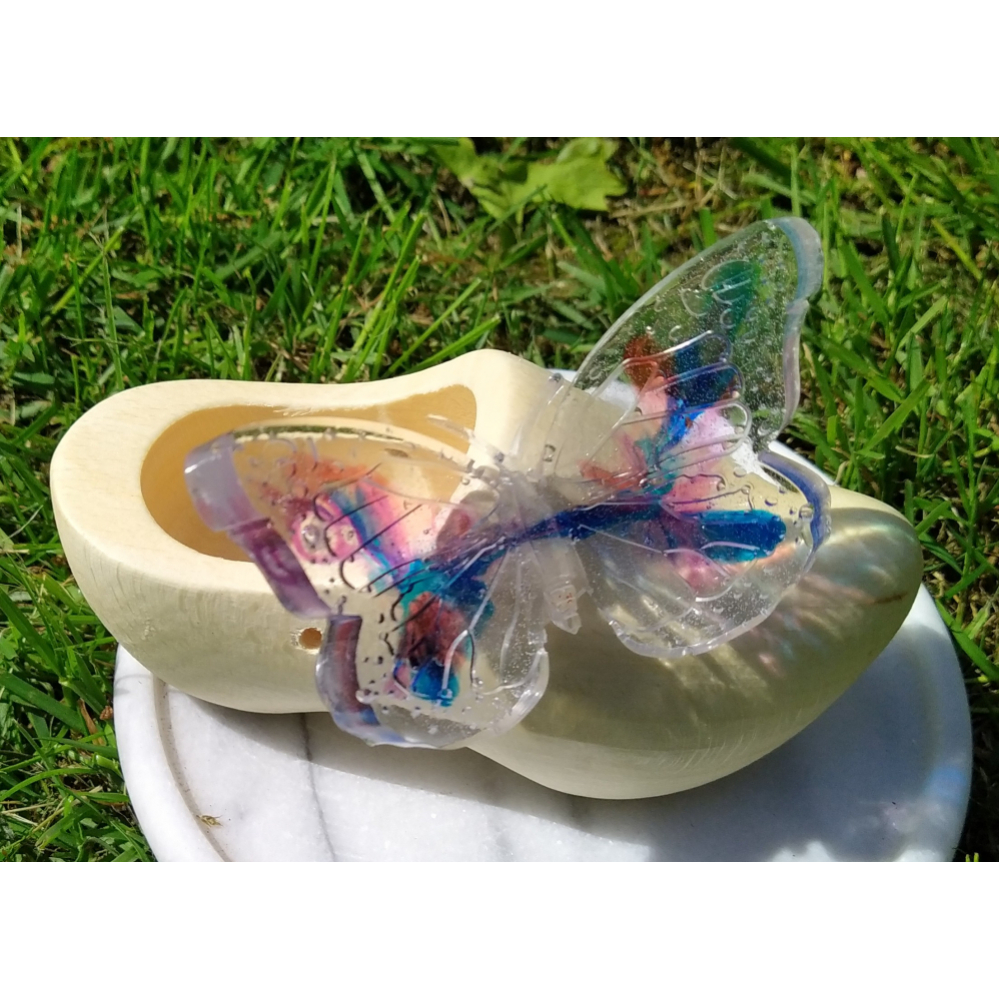 vlinder van epoxy op een houten klompje van ca.14 cm.