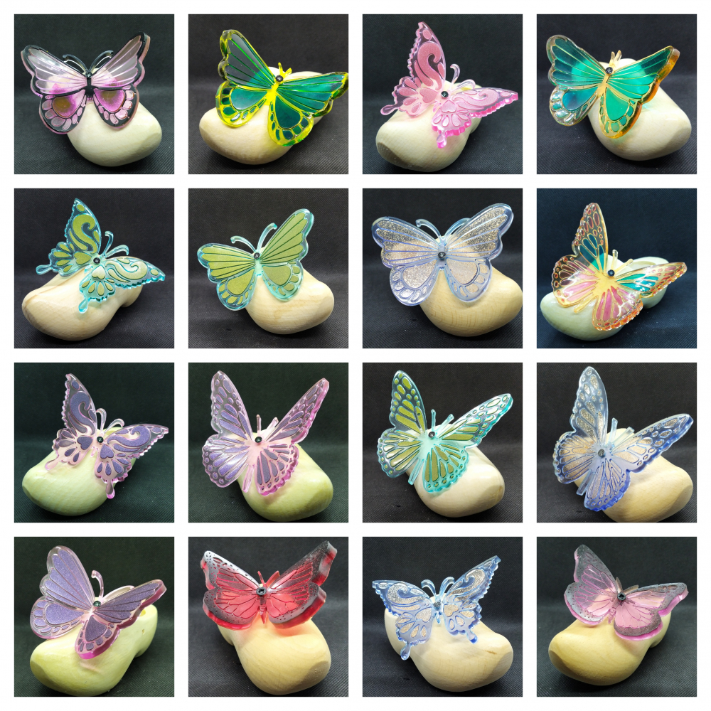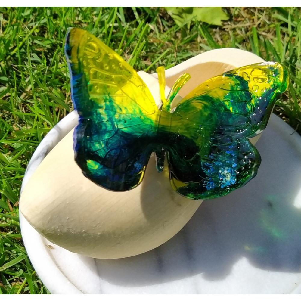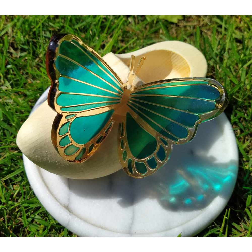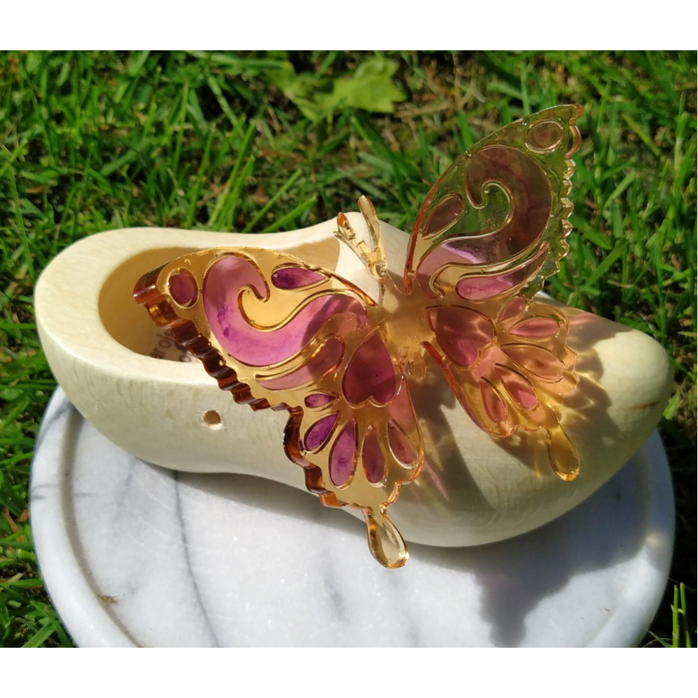 vlinder van epoxy op een houten klompje van ca.14 cm.